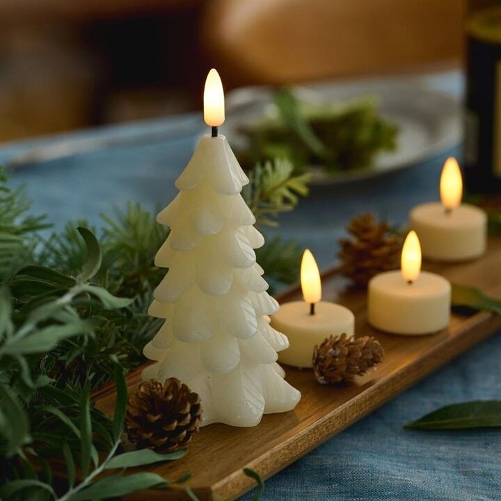 冬のインテリアにぴったりな本物のワックスで作られた、モミの木の形をしたLEDキャンドル。